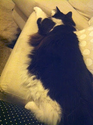 Here is a bonus picture of Graham asleep on the couch the other night, looking as if he is dreaming of pew pew pew. He looks very fat but that is partly a combination of fluffiness and foreshortening. Partly.